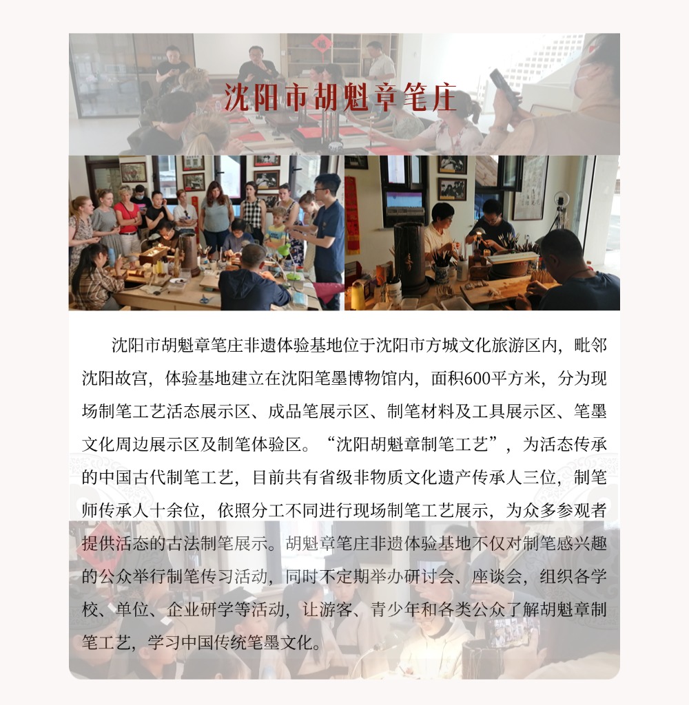 日前,省文化和旅游厅公布2025辽宁省非遗体验基地优秀案例名单,沈阳市胡魁章笔庄等14个体验基地入选。
