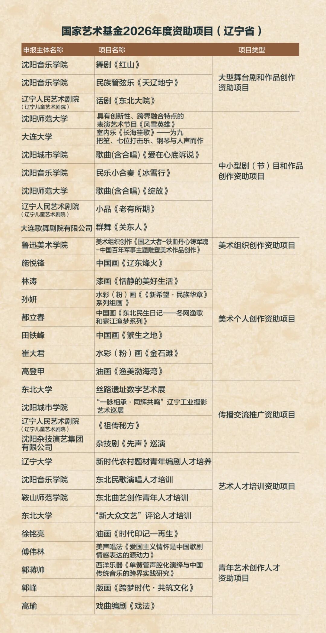 2025年12月2日,国家艺术基金(一般项目)2026年年度资助项目名单正式公示,辽宁省共有31个项目成功入选,立项数量位居全国前十位,较2025年度增幅达72.2%,创下年度增幅新高。