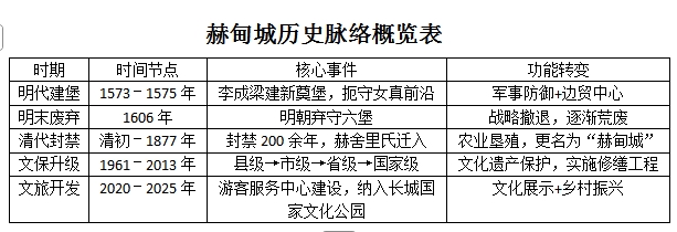2020年,国家启动长城国家文化公园建设,全国重点文物保护单位长城--明长城--赫甸城城址游客服务中心建设及环境整治工程被确认为国家层面一般建设项目。目前,已完成全部工程项目,与此前竣工终验的赫甸城城址东城墙北城墙修缮工程形成互补,充分彰显了赫甸城城址的文化魅力和澳客 融合发展的巨大潜力。赫甸城(原名新奠堡)是明代辽东长城防御体系“宽甸六堡”的核心组成部分,位于今辽宁省丹东市宽甸满族自治县青椅山镇赫甸村。其历史脉络可分为四个关键阶段: